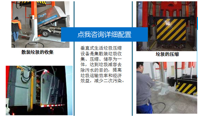 該產品適用于城鎮生活垃圾的儲存、壓縮和轉運,通常可設置在靠近街道及居民生活小區內,是當今生活垃圾處理的理想設備。
