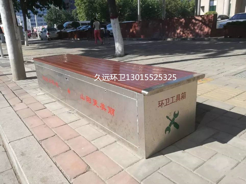 環衛工具箱:也叫保潔員工具箱,環衛工具椅,保潔員休息座椅,市政保潔箱等。工具箱常用尺寸為:長2400*寬500*高550mm,也可以做成2米,2.4米,2.7米等,寬度和高度也可以定做,滿足不同客戶、不同場所的使用要求。